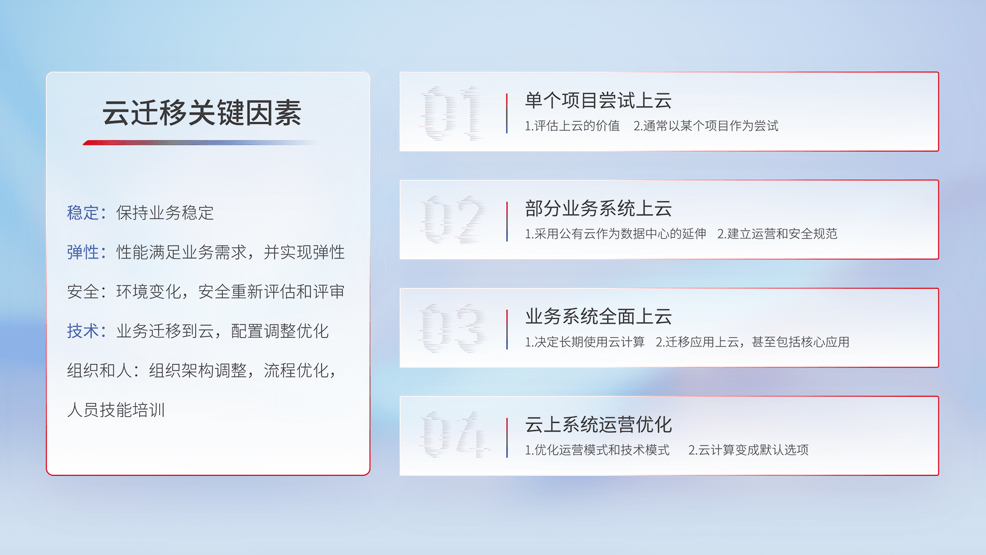 结合实际业务,,从规划设计、、云平台选型、、云原生改造、、数据迁移、、、集成交付,,迁移全过程为客户识别最佳上云路径,,做好风险识别管理,,设计网络架构、、、、身份权限、、、、安全审计合规、、、操作审计、、、日志审计、、、监控告警策略、、、多站点容灾设计等,,对云上基础设施进行整体规划,,,提升IT治理水平,,,,以满足弹性、、、、高可用、、、高性能的需求。。。。